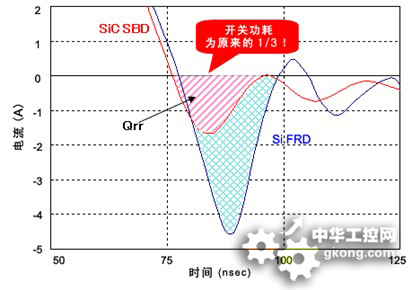 圖2:相比SiFRD(碳化硅快速恢復(fù)二極管),SiC-SBD的功率轉(zhuǎn)換效率大幅提升。(來源:ROHM公司)。