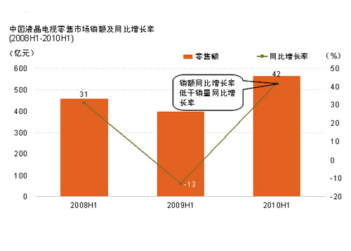 根據(jù)捷孚凱(GfK 中國)全國液晶電視零售推算數(shù)據(jù),2010年上半年液晶電視市場整體規(guī)模為1517萬臺,同比2009年上半年規(guī)模增長55.2%,而銷售額同比增長42%。上半年度整體彩電市場規(guī)模為1863萬臺,液晶電視在整個彩電市場中的占比已經(jīng)達(dá)到82%。
