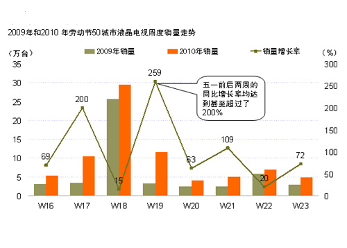 剛剛過去的五月,讓我們對于旺季銷售有了一個新的認(rèn)識。根據(jù)捷孚凱(GfK 中國) 50城市液晶電視周度監(jiān)測報告顯示,今年的勞動節(jié)前后三周(第16、17和第19周)的銷量較去年同期有大幅增長,甚至遠(yuǎn)遠(yuǎn)大于勞動節(jié)(第18周)的增長率。從銷量的分布上來看,勞動節(jié)前后三周的銷量之和已經(jīng)超過了節(jié)日當(dāng)周的銷量,而在以往,由于旺季促銷因素,消費(fèi)非常集中,特別是節(jié)后的銷量會迅速跌至谷底,就如去年勞動節(jié),前后三周之和甚至不及節(jié)日當(dāng)周的一半。回顧以往的國慶和勞動節(jié)旺季莫不如此。今年的勞動節(jié)市場徹底打破了這一傳統(tǒng)。
