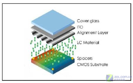 LCOS面板的結(jié)構(gòu)有些類似TFTLCD,一樣是在上下二層基板中間撒布Spacer以加以隔絕后,再填充液晶于基板間形成光閥,藉由電路的開關(guān)以推動(dòng)液晶分子的旋轉(zhuǎn),以決定畫面的明與暗。LCOS面板的上基板是ITO導(dǎo)電玻璃,下基板是則矽晶圓CMOS基板,LCOS面板最大的特色在于下基板的材質(zhì)是單晶矽,因此擁有良好的電子移動(dòng)率,而且單晶矽可形成較細(xì)的線路,因此與現(xiàn)有的HTPSLCD及DLP投影面板相較,LCOS是比較容易達(dá)成高解析度的投影技術(shù)。