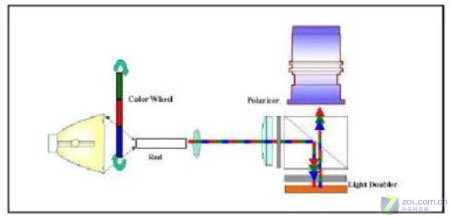 單片式ColorWheel光學(xué)引擎則是以快速旋轉(zhuǎn)的ColorSwitch將白光形成循序的紅、藍(lán)、綠光,并將三原色光與驅(qū)動(dòng)程式產(chǎn)生的紅、藍(lán)、綠畫面,同步形成分色影像,再藉由人眼視覺(jué)暫留的特性,最后在人腦產(chǎn)生彩色的投影畫面。類似的技術(shù)有:Displaytech發(fā)表的FieldSequentialColor、Philip所采用的ScrollingColor-RotatingPrism架構(gòu)、及JVC采用的SpatialColor–Hologram架構(gòu)。[page]