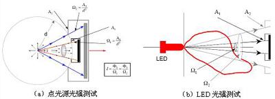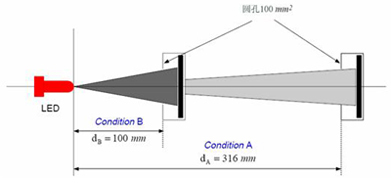 圖4中,點光源光強在空間各方向均勻分布,在不同距離處用不同接收孔徑的探測器接收得到的測試結(jié)果不會改變。但是,LED由于其光強分布不一致,使得測試結(jié)果隨測試距離和探測器孔徑而變化。因此,CIE-127提出了兩種推薦測試條件,使得各個LED在同一條件下進行光強測試與評價如圖5所示。目前,CIE-127推薦測試條件已經(jīng)被各LED制造商和檢測機構(gòu)引用。