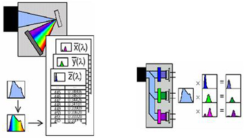 現(xiàn)有的顏色特性測試方法有分光光度法和積分法。分光光度法是通過單色儀分光測得LED光譜功率分布,然后利用色度加權(quán)函數(shù)積分獲得對應(yīng)色度參數(shù);積分法是利用特定濾色片配合光電探測器直接測得色度參數(shù)(見圖7)。分光光度法的準確性要大大高于積分法。