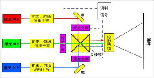 激光顯示系統(tǒng)主要由三基色激光光源、光學(xué)引擎和屏幕三部分組成。光學(xué)引擎則主要由紅綠藍(lán)三色光閥、合束X棱鏡、投影鏡頭和驅(qū)動(dòng)光閥組成,光閥驅(qū)動(dòng)使光閥上分別生成紅、綠、藍(lán)三色對(duì)應(yīng)的小畫(huà)面,然后分別引入三色激光照明投影到屏幕上,即產(chǎn)生全色顯示圖像。充當(dāng)光閥及驅(qū)動(dòng)源的可以是各種微型顯示系統(tǒng)、如LCD,LCoS,DMD,GLV等。