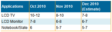 在美國,2010年第四季度零售市場銷售活躍,CCFL背光機(jī)種為主要熱銷產(chǎn)品,但該市場并未緩減所有品牌商的庫存壓力。大部分品牌商都仍面臨著LED背光液晶電視模塊居高不下的庫存問題。因此我們估計在2011年第一季度,品牌商將會趕在3月份新模塊上線前,加大促銷力度重點(diǎn)投放LED背光液晶電視。在中國,截止12月末,假期期間良好的銷售有效地減緩了庫存壓力,我們估計液晶電視庫存將在12月底降低到中等水平。