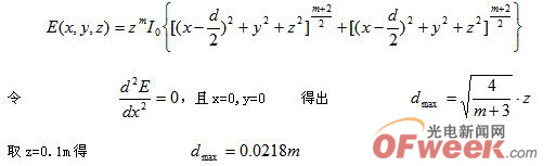 d增加到0.0218時,原點附近的區(qū)域的光照度不至下降很多,此距離比較合適。通過仿真可以驗證計算結果,如圖1所示,當d=0.0218m時,原點附近照度較均勻。 [page]