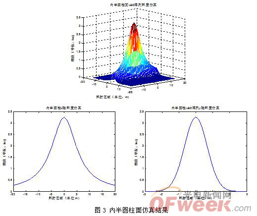 對于以上分析的兩種陣列,所用LED及數(shù)目均相同,但是根據(jù)仿真結果我們可以看出,在照度大小、照射區(qū)域等方面存在很大的區(qū)別。代表平面的矩形分布的陣列中心照度比較大,達到了40Lux,但是其照射區(qū)域比較小,20Lux內(nèi)僅有約0.75m的范圍內(nèi),而代表曲面的內(nèi)半圓柱表面分布的陣列中心照度比較小,僅為3.3Lux,但照射區(qū)域比較大,最大照度值一半的區(qū)域在一方向上達到了7m。