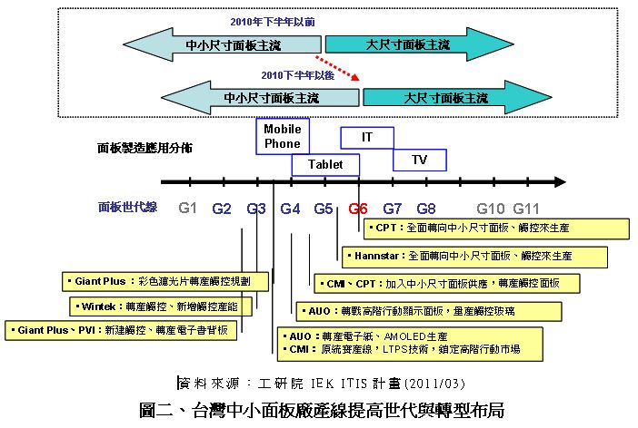 2011年是中小尺寸面板產(chǎn)線的轉(zhuǎn)型之重要年度,由于面板廠朝向更高世代生產(chǎn)大尺寸液晶面板更具有規(guī)模效益,故目前電視用面板主流切割世代廠走向7~8代,進(jìn)而開啟6代以下開始大量生產(chǎn)中小尺寸面板逐漸成為主流。同時(shí),走向觸控面板的生產(chǎn)制造結(jié)合,亦成為共同走向。
