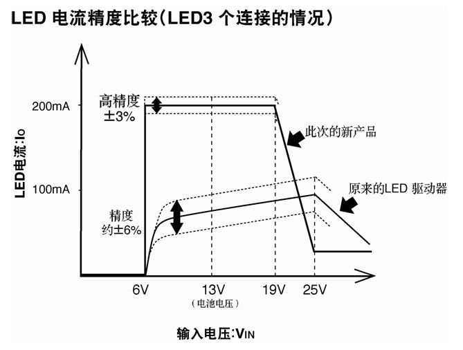 最近,汽車尾燈改裝LED燈的發(fā)展速度驚人,以低耗電量、長壽命這一優(yōu)點(diǎn)為背景,今后也將日益推進(jìn)汽車尾燈的LED化。此外,目前的LED尾燈是采用了10~20個(gè)LED發(fā)光二極管組成形式,但隨著LED的高亮度化和向普及型汽車的滲透, 減少LED發(fā)光二極管數(shù)量和其他器件用量的需求增高。在這樣的市場潮流中,即使是LED驅(qū)動(dòng)器IC,對(duì)高精度化,高功率方面的需求也越來越高。因此,急需開發(fā)出車載尾燈用高性能LED驅(qū)動(dòng)器。此次羅姆開發(fā)的尾燈專用LED驅(qū)動(dòng)器IC, 因確保了200 mA的輸出電流,與以往的LED驅(qū)動(dòng)器相比,輸出電流增加了3~5倍左右,從而使LED的高亮度化成為可能。另外,由于大幅改善了輸出電流精度,增大了LED誤差的容許范圍,尾燈組裝工序的成品率大幅改善。再有驅(qū)動(dòng)方式采用了源驅(qū)動(dòng)方式,驅(qū)動(dòng)IC電路板與LED電路板的結(jié)線,與以往的同步驅(qū)動(dòng)方式的2處相比,削減到1處后, 可以很容易實(shí)現(xiàn)車載用途所要求的開/短路檢測(cè)。再有,尾燈點(diǎn)燈時(shí)和剎車燈點(diǎn)燈時(shí)的亮度(電流量)可以自由設(shè)定的獨(dú)立電流設(shè)定等,在很大程度上方便了車載尾燈的設(shè)計(jì)。由P-BUS功能及LED開/短路檢測(cè)保護(hù)功能得以實(shí)現(xiàn)的故障安全功能也更加充實(shí)。