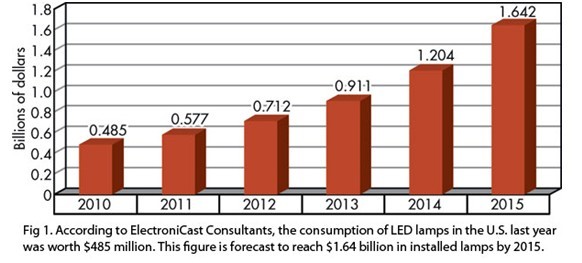ElectroniCast Consultants最近公布的市場研究報(bào)告認(rèn)為,去年美國消費(fèi)的LED燈泡價(jià)值4.85億美元。該公司預(yù)測,以2015年該數(shù)字將達(dá)到16.4億美元。