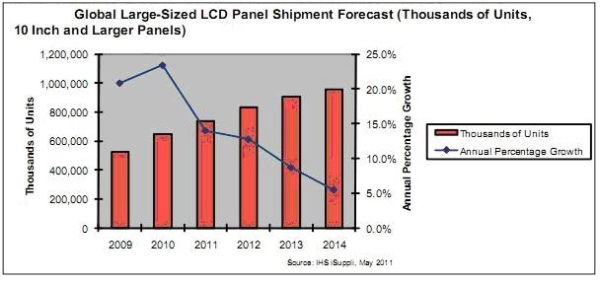 IHS iSuppli公司的研究顯示,第一季度電視、臺(tái)式電腦顯示器和筆記本電腦的消費(fèi)需求低迷,將導(dǎo)致2011年全球大尺寸液晶面板出貨量增長(zhǎng)速度低于2010和2009年。2011年全球大尺寸液晶面板出貨量將僅增長(zhǎng)14%,而2010和2009年分別是23.4%和20.8%。今年的單位出貨量將為7.4億塊,高于2010年的6.493億塊。