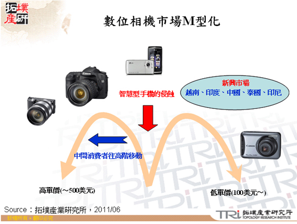 據(jù)拓墣研究所,受到消費(fèi)族群往高端相機(jī)產(chǎn)品移動(dòng),以及新興市場(chǎng)所帶動(dòng)的低端消費(fèi)型相機(jī)銷售量,造成數(shù)碼相機(jī)市場(chǎng)兩端銷售狀況高起,市場(chǎng)呈現(xiàn)M型化的現(xiàn)象,2011下半年數(shù)碼相機(jī)的銷售量將會(huì)成長(zhǎng)到7,900萬臺(tái)。