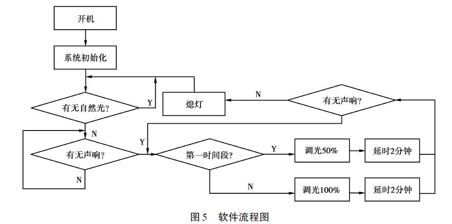 (2)當無光(自然光)時,若有人經(jīng)過產(chǎn)生聲響,控制器先判斷時間段,若是在天色完全暗下來時(定義為第一時間段),則使LED發(fā)出100%亮度。其余時間段即天色還較亮,控制器可輸出50%占空比方波,使LED發(fā)出50%亮度即可,這樣可進一步節(jié)省電能,提高用電效率。