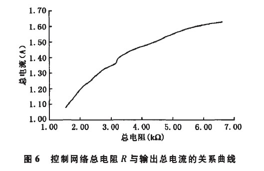 控制電路阻值與輸出總電流的關(guān)系列于表1,其中R為控制電路的等效電阻。經(jīng)過(guò)在恒溫箱中測(cè)試,每2℃記錄1組數(shù)據(jù)得到如圖5所示的NTC熱敏電阻的溫度一阻值曲線(xiàn)。該方案中,驅(qū)動(dòng)電源通過(guò)接收到反饋的溫度信息來(lái)控制輸出電流,根據(jù)圖5中NTC的溫度與阻值的關(guān)系,只要找到輸出電流隨總阻值的變化關(guān)系(如圖6所示),再進(jìn)行適當(dāng)?shù)碾娮杵ヅ洌憧烧业綔囟扰c驅(qū)動(dòng)器輸出電流的關(guān)系。