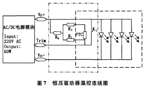 圖7為恒壓驅(qū)動(dòng)器溫控的連線(xiàn)圖。Trim端用來(lái)調(diào)節(jié)電源的輸出。左側(cè)點(diǎn)線(xiàn)型虛線(xiàn)框中部分為控制電路,其中:PTC為正溫度系數(shù)溫敏電阻;R1、R2、R,均為普通電阻,與PTC溫敏電阻匹配調(diào)節(jié)驅(qū)動(dòng)器輸出電壓;Kt為常閉型溫度繼電器,其斷開(kāi)溫度為60℃,自動(dòng)閉合溫度為48%。右側(cè)虛線(xiàn)框中部分為L(zhǎng)ED模塊部分。Kt和PTC安裝在LED模塊上,并與模塊緊密接觸。常溫下Kt處于閉合狀態(tài),此時(shí)控制電路中控制驅(qū)動(dòng)器額定輸出,該LED模組常溫工作額定總電壓為24V。當(dāng)繼電器溫度上升到60℃時(shí)Kt