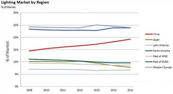 經(jīng)濟(jì)發(fā)達(dá)地區(qū)比如北美和歐洲將會是照明市場增長的主要區(qū)域,將會占到50%左右的市場份額($US)。2010年,中國占到全球照明市場的14%,2015年預(yù)計(jì)會增至20%。持續(xù)的經(jīng)濟(jì)增長,建設(shè)熱潮,對于電力消耗增大的擔(dān)憂以及公眾購買能力的提升會影響該區(qū)域的市場。