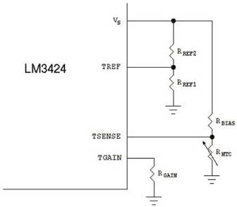 為了實(shí)現(xiàn)根據(jù)溫度調(diào)節(jié)LED電流的目標(biāo),可以使用多種不同的方法。一種方法是構(gòu)建溫度感應(yīng)電路,用于驅(qū)動(dòng)LED驅(qū)動(dòng)器集成電路的模擬電流調(diào)節(jié)針腳。更簡(jiǎn)單的解決方法是使用LM3424等具有內(nèi)置熱返送功能的LED驅(qū)動(dòng)器集成電路。圖2顯示了LM3424熱返送功能所需的外部零部件示例。