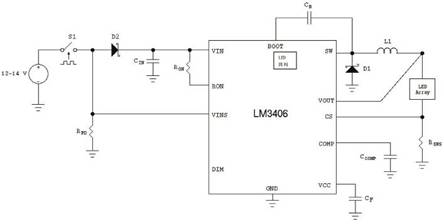 對(duì)于此應(yīng)用的調(diào)光和閃光部分,可以使用多種方法降低向LED陣列提供的功率。最常用的一種方法是脈寬調(diào)制調(diào)光,這種方法通常使用專門的邏輯信號(hào)高速開啟和關(guān)閉LED以控制總體光輸出。這種方法簡(jiǎn)單有效,但可能極少用于汽車電子系統(tǒng)應(yīng)用,因?yàn)樵诰€束中需要一根額外的線路用于調(diào)光信號(hào)。另一種方法稱為雙線調(diào)光,向LED驅(qū)動(dòng)器提供的電源定期中斷以控制調(diào)光。1.5A整體式開關(guān)穩(wěn)壓器LM3406具有此功能,其真實(shí)電流平均值實(shí)現(xiàn)更嚴(yán)密的光輸出控制。集成的N通道MOSFET不提供控制器集成電路具有的靈活性,因此降低了板上的復(fù)雜性。圖8顯示了使用雙線調(diào)光方法的LM3406應(yīng)用示例。