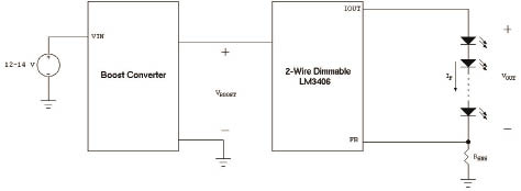根據(jù)具體的設(shè)計(jì),上述問題的影響可能可以忽略。但是,如果系統(tǒng)設(shè)計(jì)師對(duì)上述影響存有顧慮,可以采用單個(gè)串聯(lián)燈組作為首選拓?fù)浣Y(jié)構(gòu)。在這種解決方法中,仍可以使用LM3406等部件,但將增大系統(tǒng)復(fù)雜性,因?yàn)樾枰虑岸瞬考糜趥鬏敵?2V~14V的電源電壓為L(zhǎng)ED驅(qū)動(dòng)器供電。然后,LED驅(qū)動(dòng)器降低此新電壓,為單個(gè)LED燈組供電。這可以通過在直流電源和LM3406之間增加升壓DC/DC功率級(jí)輕松實(shí)現(xiàn),如圖10所示。通過此拓?fù)浣Y(jié)構(gòu),串聯(lián)燈組中的所有LED均具有相同的電流,無論各LED的VF值是多少。