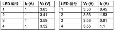 下例顯示了VF變化的影響。在實(shí)驗(yàn)中,使用圖9所示兩種設(shè)置收集數(shù)據(jù)。一種設(shè)置用于4個(gè)LED,另一種設(shè)置用于并聯(lián)的4個(gè)LED。表1所示數(shù)據(jù)在25℃加電后5秒內(nèi)測(cè)得,以最大限度降低LED自發(fā)熱的影響、