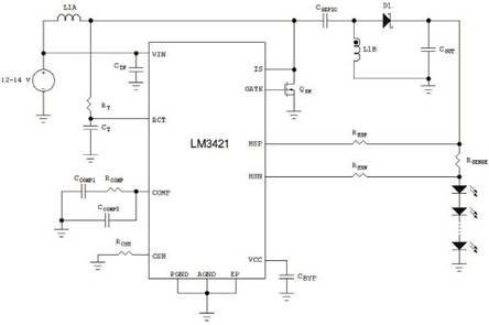 LM342x系列使用控制器集成電路實(shí)現(xiàn)所需功能和總體系統(tǒng)設(shè)計(jì)的最大靈活性。圖1以LM3421為例,顯示升壓配置中使用LM342x系列驅(qū)動(dòng)LED燈組的一個(gè)示例。LM342x拓?fù)浣Y(jié)構(gòu)的一個(gè)主要特點(diǎn)是在LED高側(cè)進(jìn)行電流感應(yīng),允許燈組中的最后LED的陰極局部在底盤接地,并使感應(yīng)電壓可以差分地饋送回集成電路。這是一個(gè)重要的優(yōu)點(diǎn),因?yàn)槭筁ED燈組和驅(qū)動(dòng)器集成電路可以彼此分離。