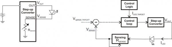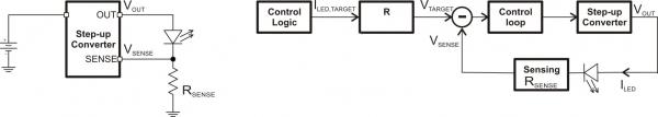 將閃光燈LED 與一個(gè)電流檢測電阻串聯(lián),然后通過一個(gè)升壓轉(zhuǎn)換器來驅(qū)動(dòng),這是一種簡單的方法。圖1 描述了這種方法。