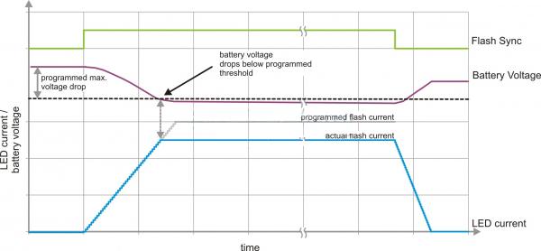 如果閃光燈驅(qū)動(dòng)器本身能夠防止電池電壓下降過多,那么就可以保持較小的安全界限。通過使用一個(gè)受控轉(zhuǎn)換率升高LED 電流,并在上升期間持續(xù)監(jiān)控電池電壓可以實(shí)現(xiàn)這一目標(biāo)。