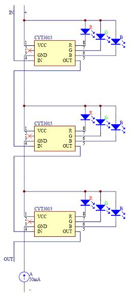 根據(jù)CYT3005單線傳輸驅(qū)動(dòng)全彩LED燈設(shè)計(jì)圖,我們可以看出,單總線傳輸設(shè)計(jì)上顯得很簡單,這也是工程上最需要的傳輸方式。