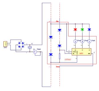 在此電路中,芯片供電利用壓差,電勢(shì)一級(jí)級(jí)的往下降,形成了梯式壓降,故而稱壓階傳輸。其實(shí),信號(hào)傳輸也利用了壓階傳輸?shù)姆绞剑酒c芯片之間的信號(hào)線串接了壓階管,這樣做的目的是經(jīng)過每一級(jí)后,降低一階信號(hào)電勢(shì),使該級(jí)芯片的信號(hào)與地之間的電勢(shì)差保持正常工作的一個(gè)差值,否則,會(huì)因?yàn)橄鄬?duì)電勢(shì)過大而燒毀芯片。我們可以注意到這個(gè)電路只要兩條線,一條供電,一條信號(hào)傳輸,供電的線是串行的,所以總線上的電流比較小,用較細(xì)的線就行了。電路的末端,用了一個(gè)CYT1A50,它可以使整個(gè)線路恒流。另一方面,由于它的端口耐壓也比較高,可以將電路上多余的壓降壓在這顆芯片上。