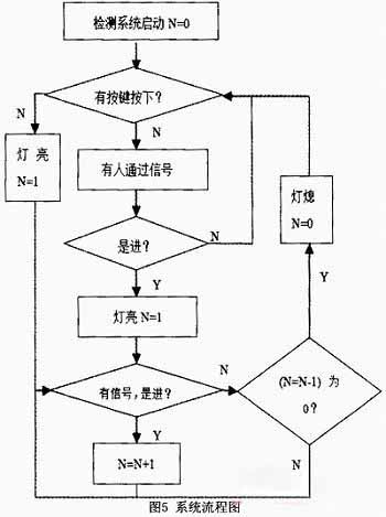 系統(tǒng)流程圖如圖5所示。其中N表示洗手間內(nèi)現(xiàn)有的人數(shù),當(dāng)檢測系統(tǒng)電源連上后,光電傳感器開始檢測,但系統(tǒng)不知道洗手間內(nèi)此時(shí)是否有人,默認(rèn)是無人,因而燈是不會亮的,這時(shí)按鍵可以用來對系統(tǒng)進(jìn)行調(diào)整。當(dāng)光強(qiáng)增大到一定值時(shí),檢測系統(tǒng)自動停止工作。