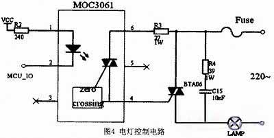 本系統(tǒng)由光電傳感器檢測洗手間內(nèi)是否有人,單片機(jī)進(jìn)行計(jì)數(shù),當(dāng)N不為零時(shí),單片機(jī)會向與MOC3061芯片引腳相連的端口輸送信號,然后通過可控硅來控制燈的開、關(guān)。其中R3是雙向可控硅的門極電阻,當(dāng)可控硅靈敏度較高時(shí),門極阻抗也很高,并上R3可提高抗干擾能力。 39Ω電阻和0.01μF電容組成浪涌吸收電路,防止浪涌電壓損壞雙向可控硅。其電路圖如圖4所示。