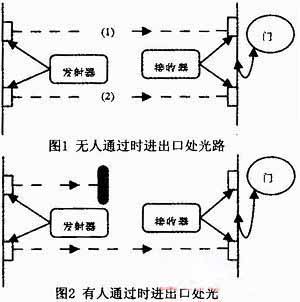 本設(shè)計(jì)的改進(jìn)之處是設(shè)計(jì)一個具有計(jì)數(shù)功能的模塊,我們可以使用對射型光電傳感器,如圖1所示在洗手間的進(jìn)口處設(shè)置兩個發(fā)射源和兩個接收源,當(dāng)有人進(jìn)或者出洗手問的門時(shí),會阻擋光線,如圖2所示,接收處就接收不到設(shè)置光源發(fā)出的光信號,這時(shí)接收處的輸出端會發(fā)出一個信號,計(jì)數(shù)器就可以通過此信號進(jìn)行計(jì)數(shù)。只要計(jì)數(shù)器里存儲數(shù)等于一時(shí),系統(tǒng)控制燈亮,大于零時(shí),該系統(tǒng)就會控制燈一直亮著,一旦為零,系統(tǒng)會控制燈延時(shí)一小段時(shí)間后自動熄滅。由于整個系統(tǒng)初啟動時(shí)無法判斷室內(nèi)是否有人,因而我們還會設(shè)置一個簡易開關(guān),供使用者進(jìn)行手控,且為方便使用者能在夜間看到開關(guān)的位置,我們可以采用表面具有夜光性能的材料來做按鍵。光電檢測系統(tǒng)的啟動由光敏傳感器控制。
