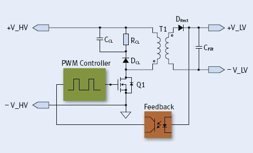 對于最高約100W的隔離電源,反激式拓撲已被廣為接受,因為它相對簡單,構(gòu)成元件少,具有成本效益優(yōu)勢且性能合理。借助飛兆半導(dǎo)體應(yīng)用手冊AN-4137,其基本工作原理簡單并易于解釋。當MOSFET Q1導(dǎo)通時,變壓器T1初級端中的電流線性斜升,建立了一個儲存能量的磁場,變壓器繞組的極性點顯示極性滿足條件以致次級端整流器DRect在此期間關(guān)斷。一旦MOSFET斷開,根據(jù)楞次定律(Lenz''s law),跨越變壓器的所有電壓的極性反轉(zhuǎn)。DRect現(xiàn)在開始導(dǎo)通且儲存在T1中的能量傳送到電容器CFilt中。PWM控制器的占空比(Duty cycle)和變壓器圈比一起決定輸出電壓,其在隔離反饋網(wǎng)絡(luò)的幫助下是穩(wěn)定的。因為初級和次級之間的不完全耦合,即漏電感的存在,網(wǎng)絡(luò)DCL、CCL 和RCL鉗位電壓突升。這對于減少Q(mào)1的電壓應(yīng)力是重要的,但同時也是功率損耗的一個來源,因為RCL中的能量被消耗了。