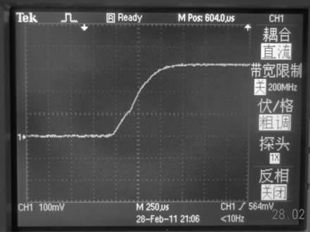 通過(guò)模擬可初步選擇40 mH 的電感作為驅(qū)動(dòng)電路所用, 圖3 是用示波器采到的電壓波形圖, 此電壓是電路中串聯(lián)了一個(gè)20 Ω 的電阻上的電壓, 穩(wěn)定后電壓為340 mV, 即電路中電流為17 mA.因?yàn)閷?shí)際電路中電流有損耗, 所以實(shí)際電流值比模擬電流值偏小, 但整個(gè)電流的變化趨勢(shì)與模擬基本一致。