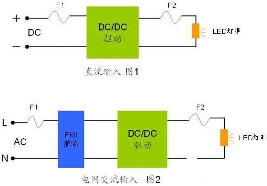 面對(duì)LED照明的眾多應(yīng)用領(lǐng)域,由于市場(chǎng)并沒(méi)有形成統(tǒng)一的規(guī)范,存在多種多樣的驅(qū)動(dòng)解決方案,但是萬(wàn)變不離其中,從過(guò)流保護(hù)的角度來(lái)看大體上根據(jù)燈體的輸入電流來(lái)可以分為:直流輸入和電網(wǎng)交流輸入兩種最基本的類型,兩種類型的主要區(qū)別在于驅(qū)動(dòng)電源是否有交流轉(zhuǎn)直流的模塊。當(dāng)然市場(chǎng)上也有很多電阻、阻容降壓等低成本解決方案,沒(méi)有EMI整流和恒流驅(qū)動(dòng)的模塊,但是由于初級(jí)端保險(xiǎn)絲的選用要求與圖2是一致,在此歸入第二種類型。