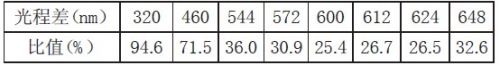 由圖1 可總結(jié)出,在有效光程差較小時(shí),可見光的各波長(zhǎng)比較聚集,顏色只有黑白兩色。在有效光程差300nm 附近出現(xiàn)一亮態(tài)極大值,之后隨著有效光程差的增大,不同波長(zhǎng)的相位差差別越大,其亮態(tài)峰值將越來(lái)越小。