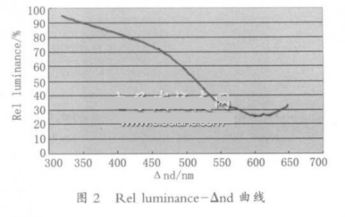 采用本試驗(yàn)總結(jié)出的以上Rel luminance- Δnd曲線,對(duì)于某一未知光程差的VA 液晶顯示器,只需簡(jiǎn)單測(cè)試出高壓光電曲線,得出高壓顯示亮度與最大值顯示亮度的比值,然后對(duì)照?qǐng)D2 所示的曲線,就可準(zhǔn)確得出相應(yīng)的光程差值。