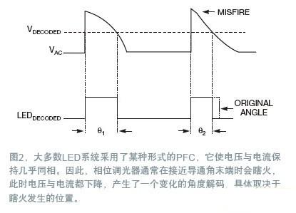 由于大多數(shù)LED系統(tǒng)都采用了某種形式的PFC,輸入電流通常能很好地追隨輸入電壓,這意味著當(dāng)電壓與電流同時(shí)下降時(shí),相位調(diào)光器經(jīng)常會(huì)導(dǎo)通角的末端瞎火(圖2)。這種瞎火會(huì)根據(jù)其發(fā)生的時(shí)點(diǎn),產(chǎn)生一種不斷變化的導(dǎo)通角解碼。