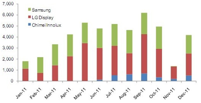 2011年9.7" iPad平板電腦面板出貨達到了4千8百萬片。雖然面板廠商之前的出貨預期更高,但受到了第四季度庫存調整的影響而最終無法達到2011年全年5千萬片以上的目標。2011年的9.7寸面板出貨以XGA(1024x768)規(guī)格為主,亮度要求為400nits以上;且采用了IPS或FFS規(guī)格的廣視角技術,而主要的面板供貨商為韓國的三星、LG Display與臺灣的奇美。根據(jù)NPD DisplaySearch每月TFT LCD面板出貨報告(Monthly TFT LCD Shipment Database),三家9.7寸面板供貨商在2011年的出貨各有千秋,如下圖所示。