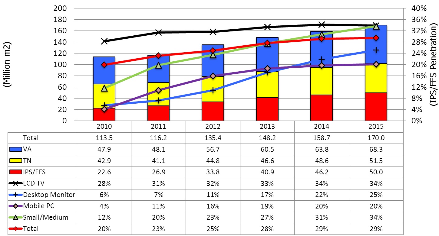 在液晶電視市場,廣視角一直是主要的賣點之一,其中IPS/FFS LCD面板的滲透率在2011年達到31%。在桌上型顯示器市場, IPS/FFS 面板傅統(tǒng)上被用在一些特殊應用,例如醫(yī)療設備,2011年滲透率為7%,而NPD DisplaySearch預測這個數字在2015年將上升到25%,主因于IPS面板的領導生產商LG Display計劃使IPS成為桌上型顯示器面板的標準。