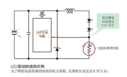 通常,開關穩(wěn)壓器IC設定的反饋電壓約為1.2V。但對于LED驅(qū)動IC,1.2V過大。因為把輸出電流轉(zhuǎn)換成電壓的數(shù)百mΩ 的電阻(電流檢測用電阻)需要與LED串聯(lián)。對于照明器具等使用的高亮度LED,流經(jīng)的是1.5A和2A等大電流。如果500mΩ的電流檢測用電阻中通過1.5A的電流,僅此一項就會產(chǎn)生0.75W的電力損耗。因此,LED驅(qū)動IC把反饋電壓設定在了非常低的0.2V左右。這樣一來,不僅可以使用較小的電流檢測用電阻,而且在大電流通過時,也可以把電力損耗控制在較低的水平。