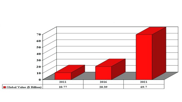報告預(yù)測,到2021年,高亮度LED的全球消費量有望達到697億美元。這個數(shù)據(jù)是指一個特定的日歷年度的消費量,而不是累積數(shù)據(jù)。
