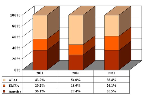 高亮度LED在美洲地區(qū)—包括南美、中美和北美—的消費量預(yù)計將從2011年的38.8億美元增至2021年的247.3億美元。2011年,歐洲、中東和非洲(EMEA)地區(qū)的高亮度LED消費量占全球市場的20.2%,隨著該地區(qū)2016年到2021年增長步伐大大加快,其市場份額也將上升。