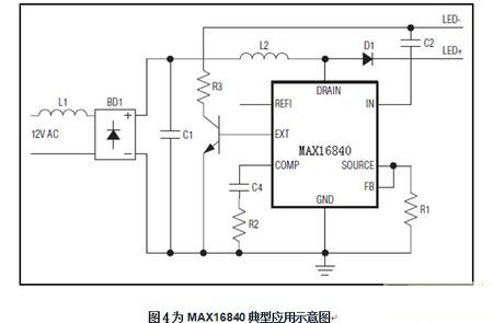 MAX16840具有的應(yīng)用特征是LED換代燈構(gòu)建技術(shù)的保證。MAX16840 集成MOSFET LED驅(qū)動(dòng)器,可用于MR16及其它12V交流輸入燈。它采用獨(dú)特的技術(shù)控制燈管的輸入電流,對(duì)輸入電流進(jìn)行整形,可使用大多數(shù)電子變壓器和調(diào)光器支持無(wú)閃爍工作,很好地解決了上述“問題的提出”之困擾。