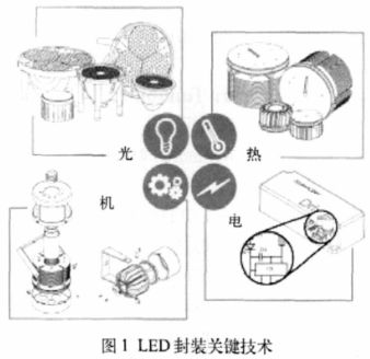 LED 的封裝技術(shù)實(shí)際上是借鑒了傳統(tǒng)的微電子封裝技術(shù),但LED 有其獨(dú)特之處,又不能完全按照微電子封裝去做。整個LED 封裝工藝主要包括封裝原料的選取、封裝結(jié)構(gòu)的設(shè)計(jì)、封裝工藝的控制以及光學(xué)設(shè)計(jì)與散熱設(shè)計(jì),概括來講就是熱- 電- 機(jī)-光(T.E.M.O.),如圖1 所示,這是LED封裝的關(guān)鍵技術(shù)。