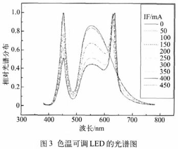 圖3為采用遠(yuǎn)方HASS-2000高精度快速光譜輻射計(jì)測量得到的色溫可調(diào)LED 的光譜圖,從圖中可以看出,隨著紅光LED 電流的變化(從0 到450mA),LED 的相對光譜也會隨之變化,LED 的光譜有三個峰值,分別在450nm、550nm和628nm,暖色溫的發(fā)光效率大于68lm/W,冷色溫的發(fā)光效率達(dá)到87lm/W。