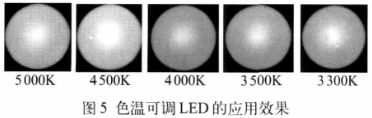 集成封裝的LED,由于工作電流較大,工作時產(chǎn)生大量的熱量,積聚在pn 結(jié)內(nèi)部的熱如不及時傳導(dǎo)出去,將導(dǎo)致器件溫度升高,溫度對LED的性能產(chǎn)生重要的影響,如色溫變化、波長紅移、正向壓降等。圖5 所示為色溫可調(diào)LED的應(yīng)用效果,將封裝好的色溫可調(diào)LED模塊安裝到100mm筒燈上,紅光LED加上不同的電流,得到筒燈的發(fā)光效果。筒燈連續(xù)點(diǎn)亮30min 后,測試筒燈上散熱器溫度為38℃,鋁基覆銅板上的溫度為38.5℃(室溫25.2℃),說明色溫可調(diào)LED 具有良好的散熱性能。