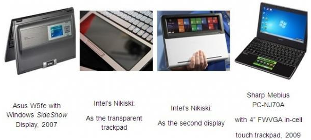 除了將觸控導(dǎo)入于筆記本電腦屏幕外,從過去到現(xiàn)在也一直有新的創(chuàng)意想法在開發(fā)、進(jìn)行中。過去當(dāng)Windows Vista問世時(shí),SideShow的功能讓筆記本電腦多了一個(gè)小屏幕(如Asus W5fe)。雖然當(dāng)時(shí)并不是觸控屏幕而是采實(shí)體按鍵,但對(duì)于一些簡(jiǎn)單的操作目的(像是信件、日程、音樂播放等),用戶就不需要打開筆記本電腦、而直接于這個(gè)小屏幕操作。后來的創(chuàng)意還有像是:SHARP將In-Cell內(nèi)嵌式觸控面板導(dǎo)入筆記本電腦的觸摸板,以及Intel于2012年CES展中所揭示的Nikiski概念。Nikiski在正常鍵盤輸入時(shí)可充當(dāng)觸摸板,合起來時(shí)又如同SideShow的附加屏幕,不過卻可以觸控支持Metro接口的使用。受限于當(dāng)時(shí)時(shí)空環(huán)境里消費(fèi)者使用情境、相關(guān)技術(shù)、成本等因素的成熟度與配合,這些創(chuàng)意或其衍伸當(dāng)時(shí)并未真正導(dǎo)入市場(chǎng),不過這并不代表這些創(chuàng)意未來就沒有面市的可能性。