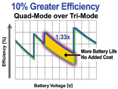安森美半導(dǎo)體專利的四模(Quad-Mode®)自適應(yīng)分?jǐn)?shù)電荷泵的能效比市場上常規(guī)的三模電荷泵高出提供10%,并減小多達65%的封裝,將LED驅(qū)動器的性能提升到了新的水平。Quad-Mode LED驅(qū)動器通常可為基于電感的LED驅(qū)動器提供高能效,同時消除較厚的電感和有害的EMI干擾。