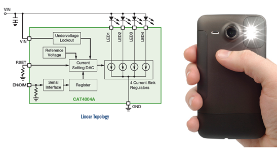 LED越來越多地應(yīng)用于拍照手機、智能手機和氙氣燈泡替代,且光輸出能力不斷提供,從而滿足更高的性能需求。安森美半導(dǎo)體的CAT3612、CAT4131、CAT4134和CAT3224都是這類驅(qū)動方案。這些器件分別采用電荷泵、電感升壓拓撲結(jié)構(gòu),可以提供不同的閃光電流和亮度。